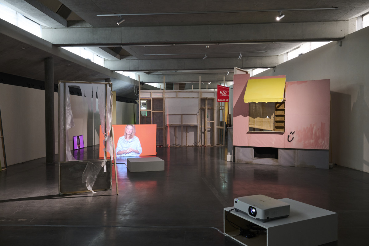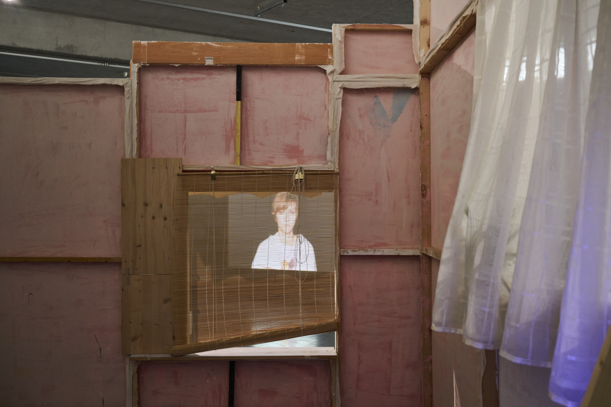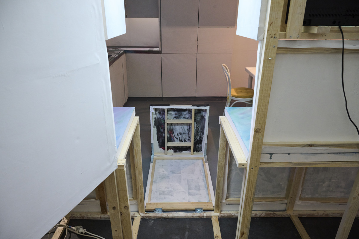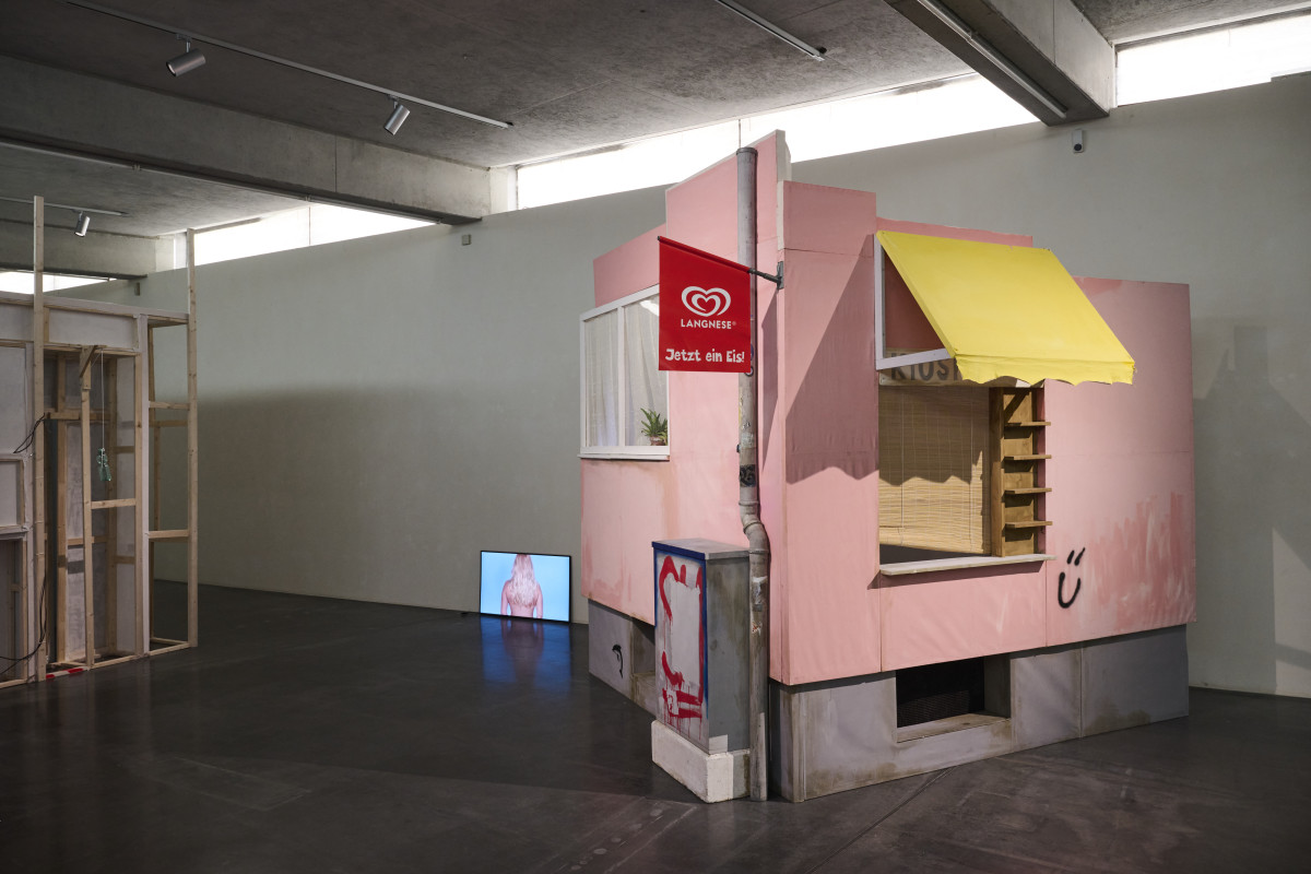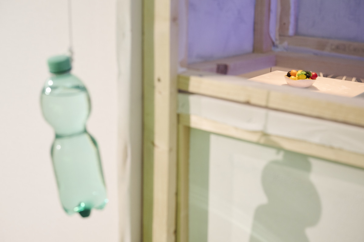 In the hall of the Kunsthaus, an expansive installation is created, sometimes live in front of an audience, which seems to be in a constant state of flux. At the center is a kitchen-like space that symbolizes the central place of every dwelling for communal eating, talking and exchange. The installation is equipped with various functions and at the same time appears dysfunctional and fragmented. Walls are not firmly anchored and seemingly solid elements are light and movable. Following on from the idea of the Heimatstube, a surrealistic setting between diorama, playing field and film set is presented. A backdrop that invites you to linger, a place of refuge, a protected space. But who is protecting themselves from what or from whom?