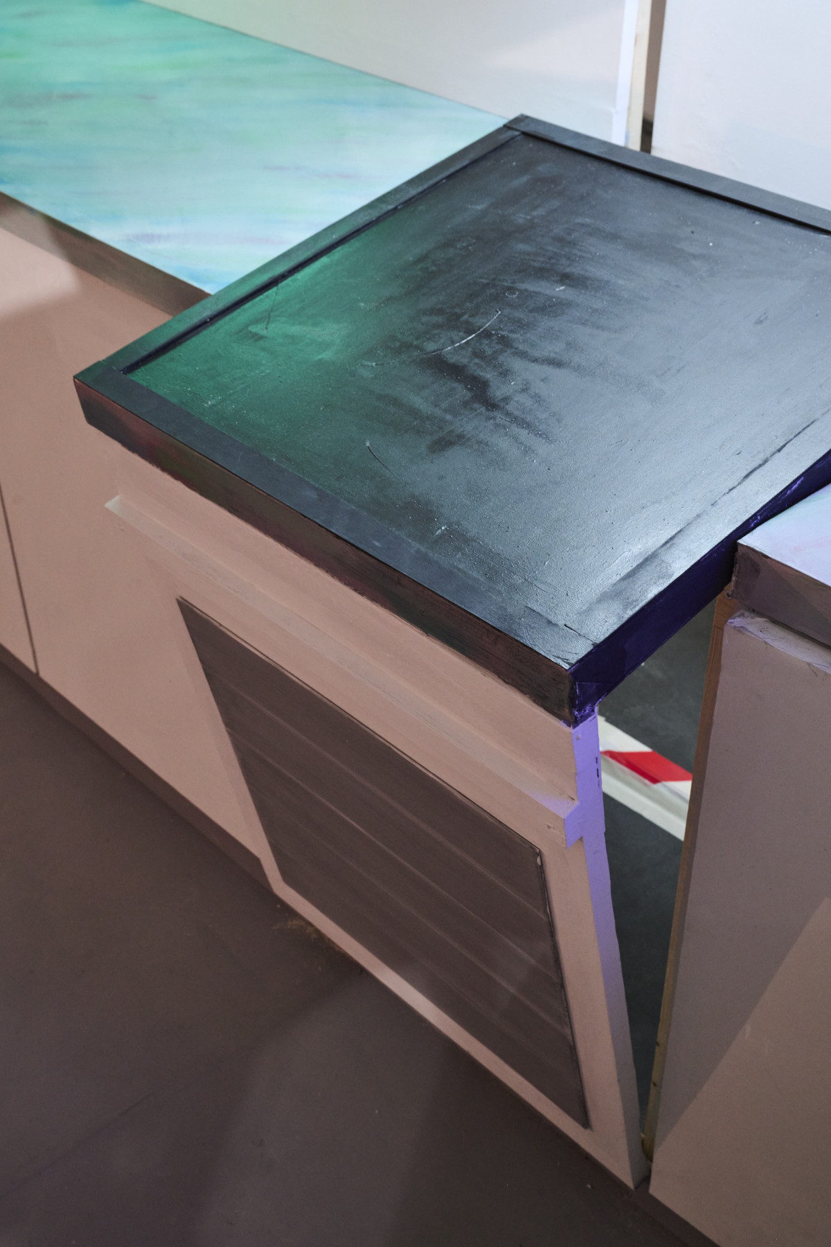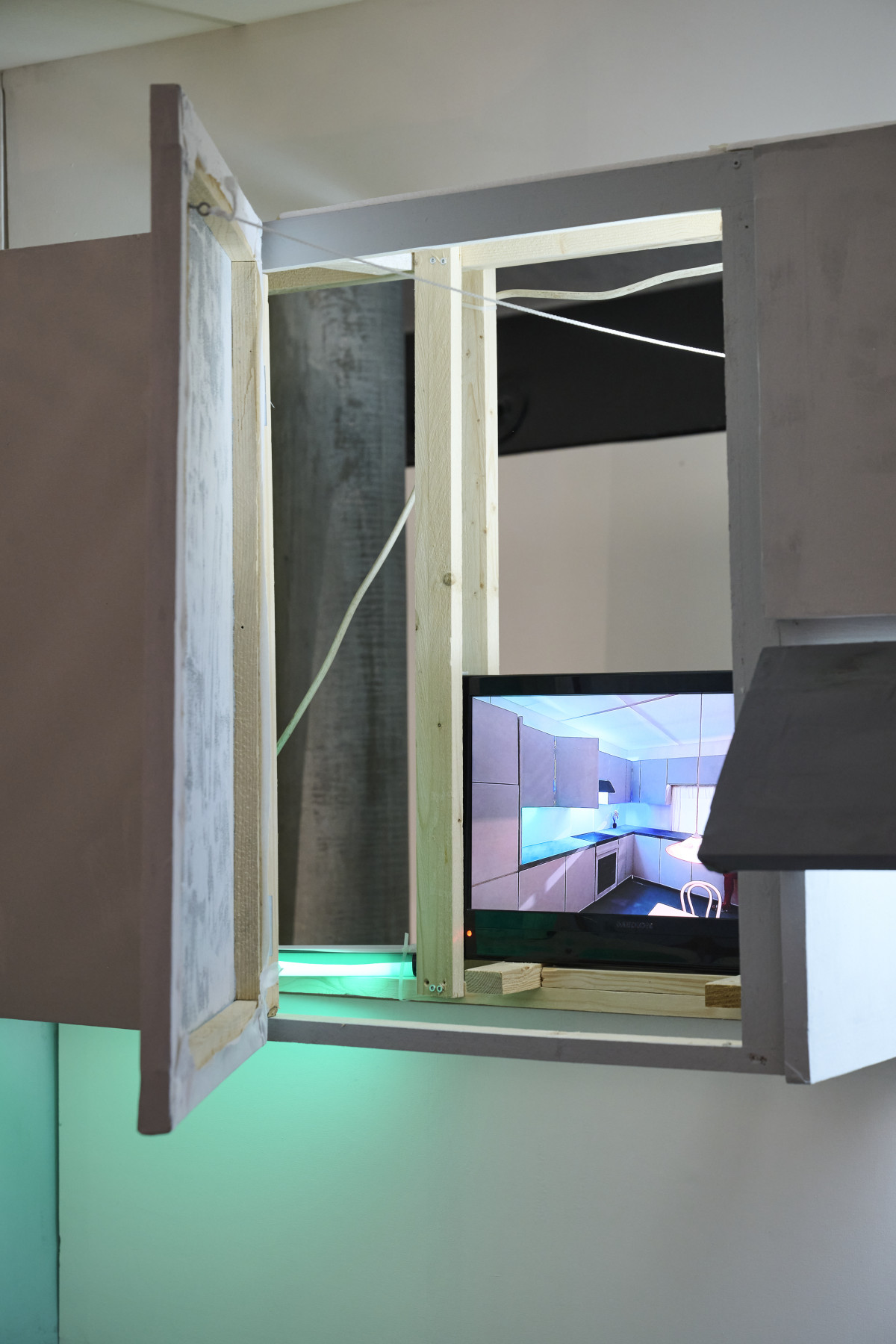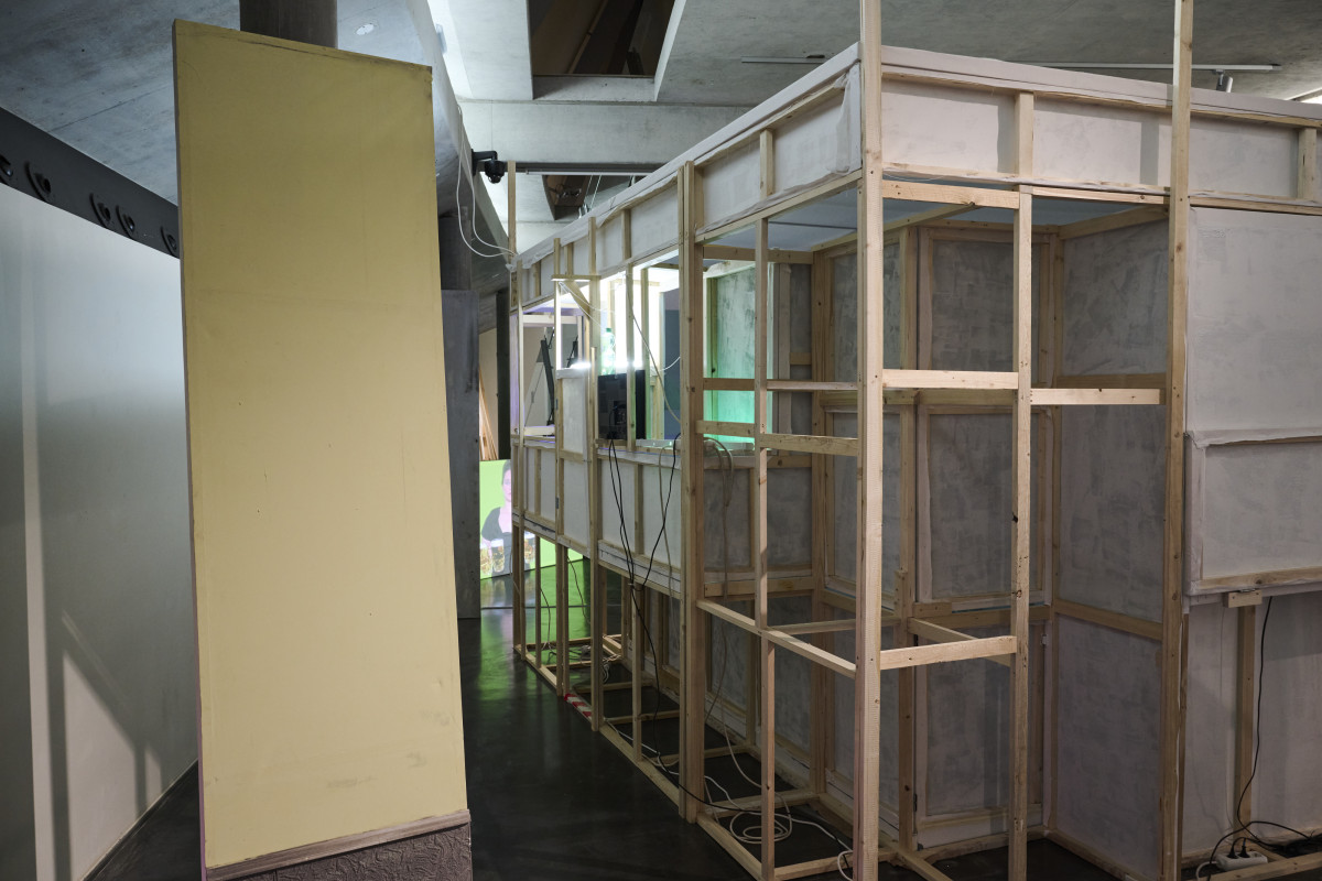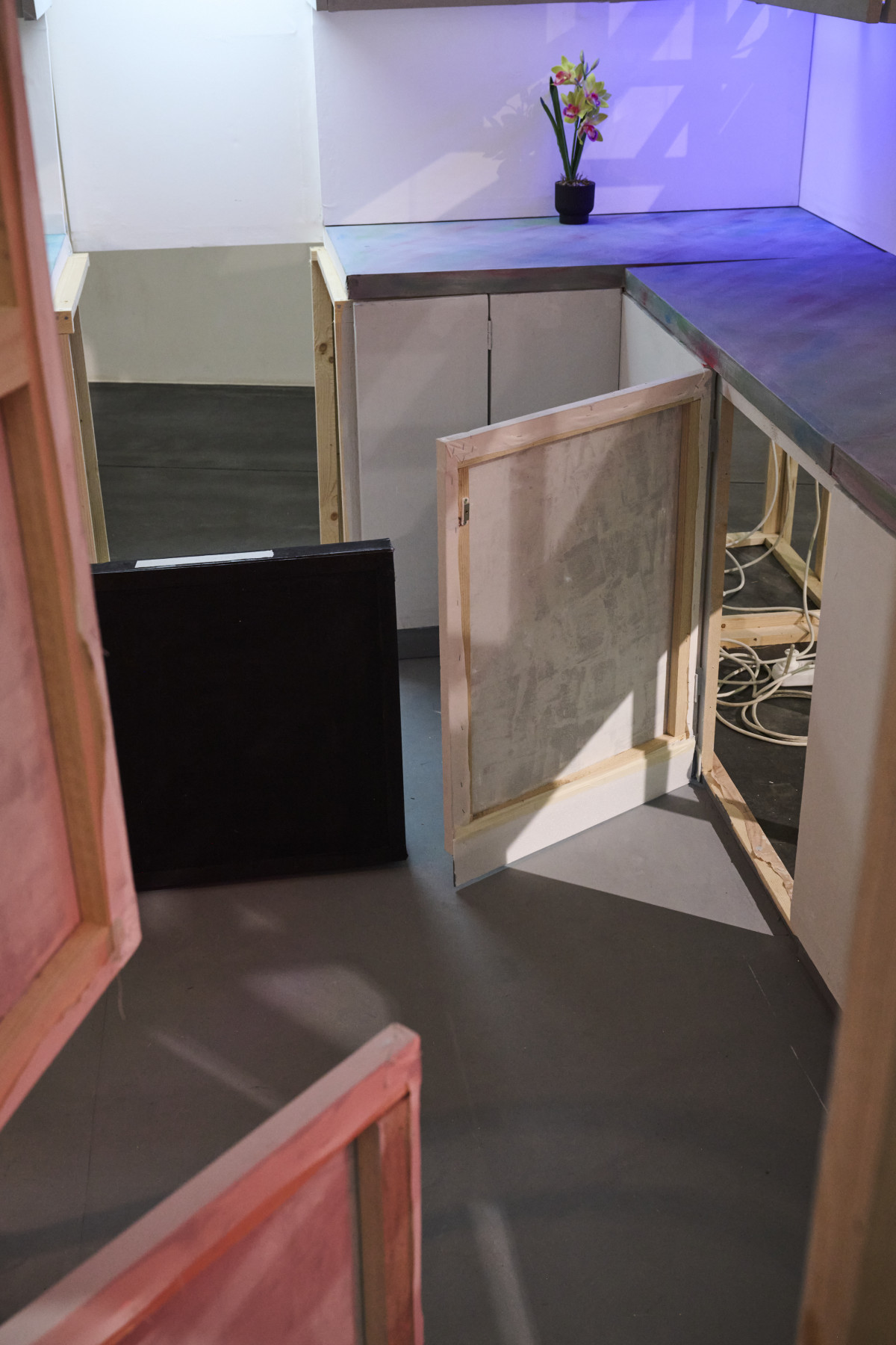In the hall of the Kunsthaus, an expansive installation is created, sometimes live in front of an audience, which seems to be in a constant state of flux. At the center is a kitchen-like space that symbolizes the central place of every dwelling for communal eating, talking and exchange. The installation is equipped with various functions and at the same time appears dysfunctional and fragmented. Walls are not firmly anchored and seemingly solid elements are light and movable. Following on from the idea of the Heimatstube, a surrealistic setting between diorama, playing field and film set is presented. A backdrop that invites you to linger, a place of refuge, a protected space. But who is protecting themselves from what or from whom?
