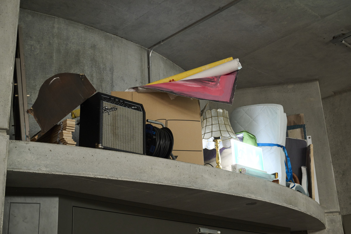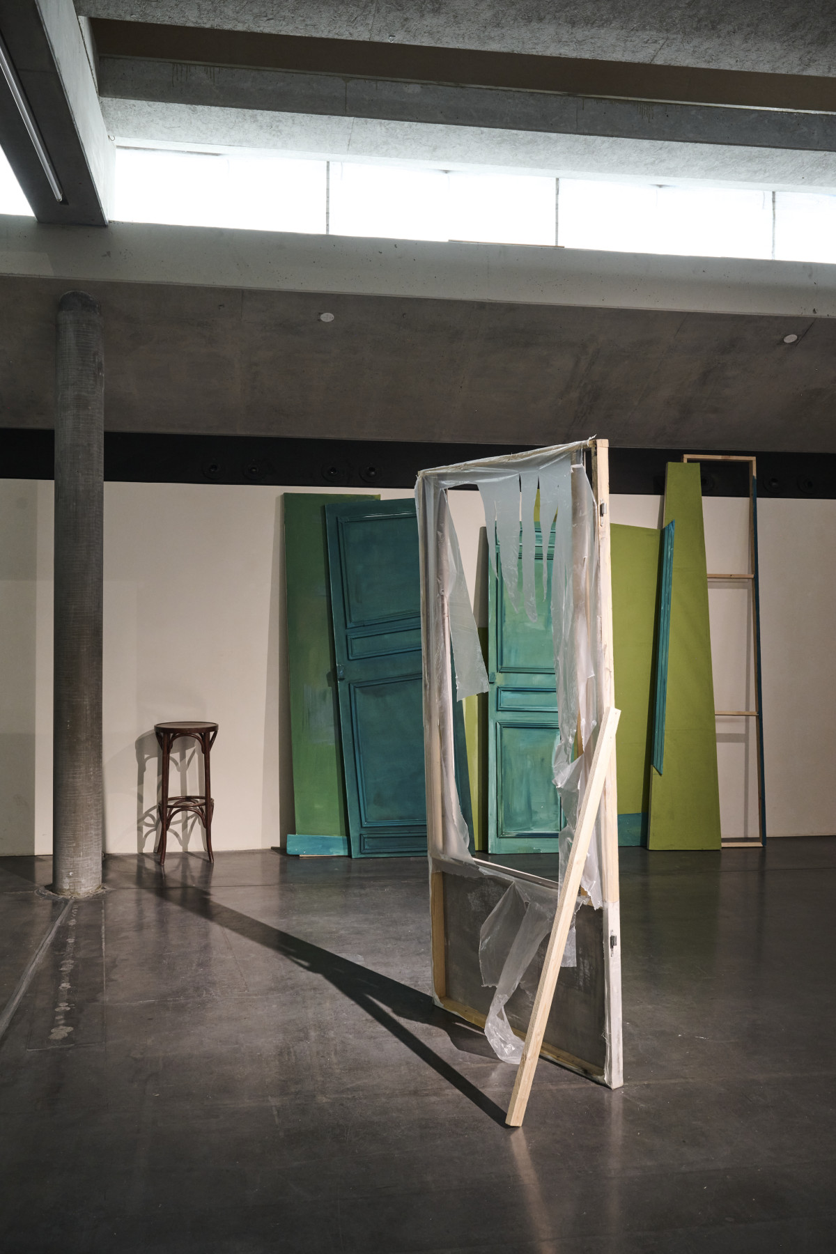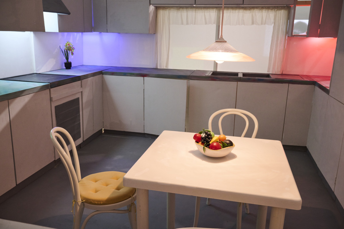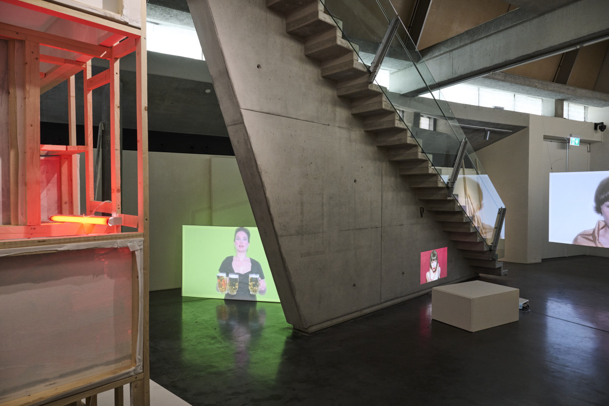 In the hall of the Kunsthaus, an expansive installation is created, sometimes live in front of an audience, which seems to be in a constant state of flux. At the center is a kitchen-like space that symbolizes the central place of every dwelling for communal eating, talking and exchange. The installation is equipped with various functions and at the same time appears dysfunctional and fragmented. Walls are not firmly anchored and seemingly solid elements are light and movable. Following on from the idea of the Heimatstube, a surrealistic setting between diorama, playing field and film set is presented. A backdrop that invites you to linger, a place of refuge, a protected space. But who is protecting themselves from what or from whom?