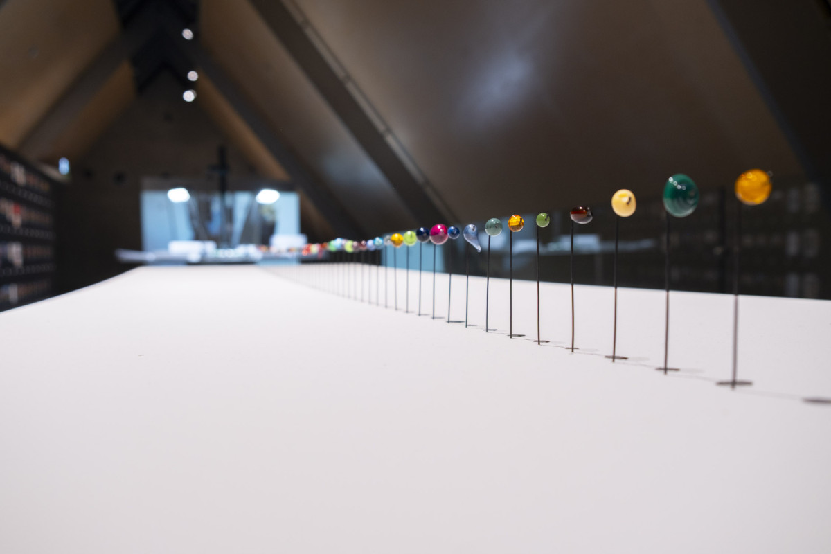 Den Ausgangspunkt bildet Frauke Zabels Ausbildung zur Silber- und Goldschmiedin an der Berufsfachschule für Glas und Schmuck Kaufbeuren-Neugablonz und das Erlernen der Technik des Glasperlenwickelns am Böhmischen Lampenfeuer. Für das zweite Kapitel des Projektes ab November 2025 werden das Handwerk und die Orte der Produktion – die Werkstätten – in den Blick genommen und die Sammlung durch Arbeiten aus dem Unterricht der Berufsfachschule ergänzt. Neben der Präsentation im Ausstellungsraum laden Spaziergänge zur Erkundung des Stadtteils ein. Gemeinsam werden Orte der gegenwärtigen und historischen Produktion besucht. Anhand der Glasperle werden Veränderungen der Produktionsprozesse und Transformationen in Neugablonz nachvollzogen. Eine neue Videoarbeit spiegelt diese Auseinandersetzung mit dem Stadtteil Neugablonz zurück in die Ausstellung im Kunsthaus.