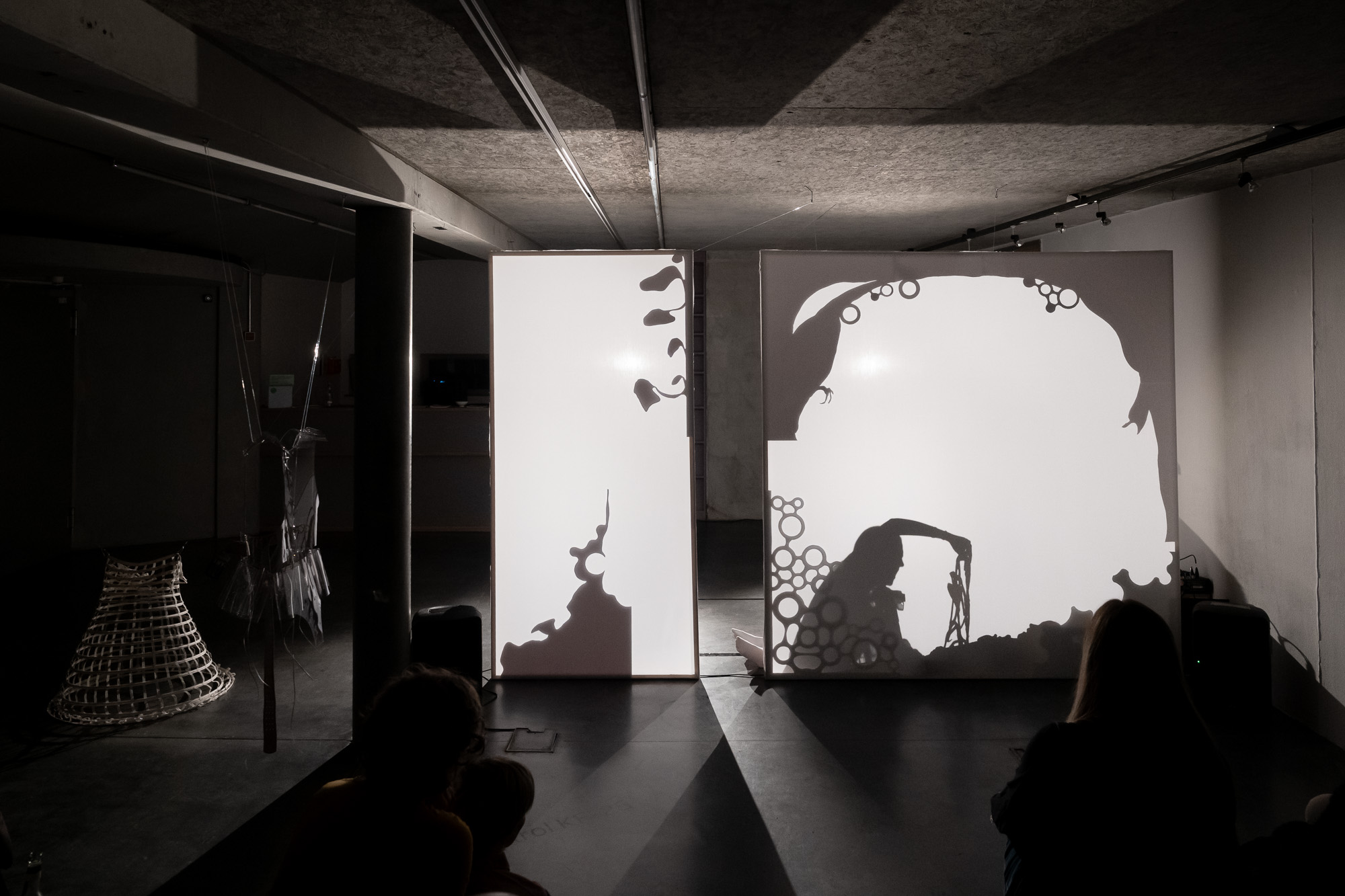 In Zusammenarbeit mit der bildenden Künstlerin Maria Moritz und der Kostümdesignerin Carla Renée Loose verbinden sich Glas, Malerei, Textil, Druck, Kostüme und Körper zu einer immersive Atmosphäre, in der sich Ebenen überlagern, in den Vordergrund verschieben oder in den Hintergrund treten. Im Oktober 2025 finden der Videodreh und eine Aufführung des Schattenspiels im Foyer des Kunsthauses statt. Die Installation Giants. Eine Reise ohne Ende verbindet die neue Videoarbeit mit dem Bühnenbild der Künstlerin Maria Moritz und Kostümobjekten von Carla Renée Loose zu einem begehbaren Raum für eine fragmentarische Erzählung über Identität als bewegliches, sich veränderndes Konzept. Die Videoinstallation verweist zurück auf filmische Traditionen, indem sie die Bewegungen der Performer*innen als Struktur für den Schnitt nutzt und zugleich mit klassischen Mitteln wie Kameraperspektive und Bildkomposition eine zusätzliche visuelle Ebene entfaltet.