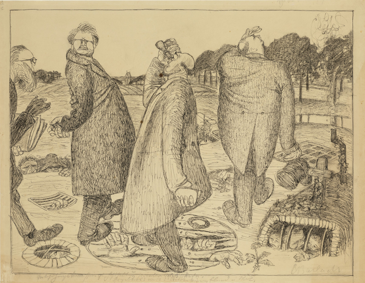Ernst Barlach, Aus dem Kommissionsbericht der Übersichtigen, 1907, Feder über Kohle auf Zeichenpapier, 449 x 591 mm, Courtesy und © Ernst Barlach Haus, Stiftung - Hermann F. Reemtsma, Hamburg