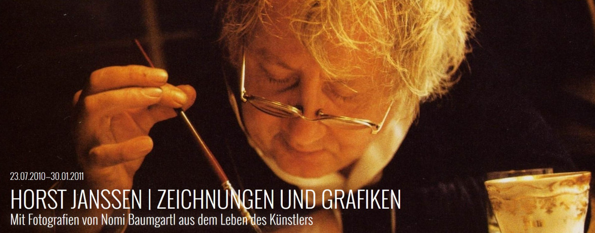 Die international renommierte Fotografin Nomi Baumgartl konnte 1984 Horst Janssens Vertrauen gewinnen, ihn in seinem Blankeneser Refugium (seiner „Burg“, wie er sein Atelier und zu Hause nannte) über Wochen hinweg fotografisch zu begleiten. Entstanden sind zarte, fast schon intime Bildserien von Horst Janssen, in denen er zum einen ganz er selbst ist, zum anderen sich aber auch vor der Kamera mal als kindlicher, mal als charmanter Mann, mal als androgynes Wesen inszeniert. Überraschend sind auch die ihn umgebenden Dinge, die einen starken Bezug zu seinen Bildern erkennen lassen, vor allem das Motiv der „vanitas“, der Vergänglichkeit.