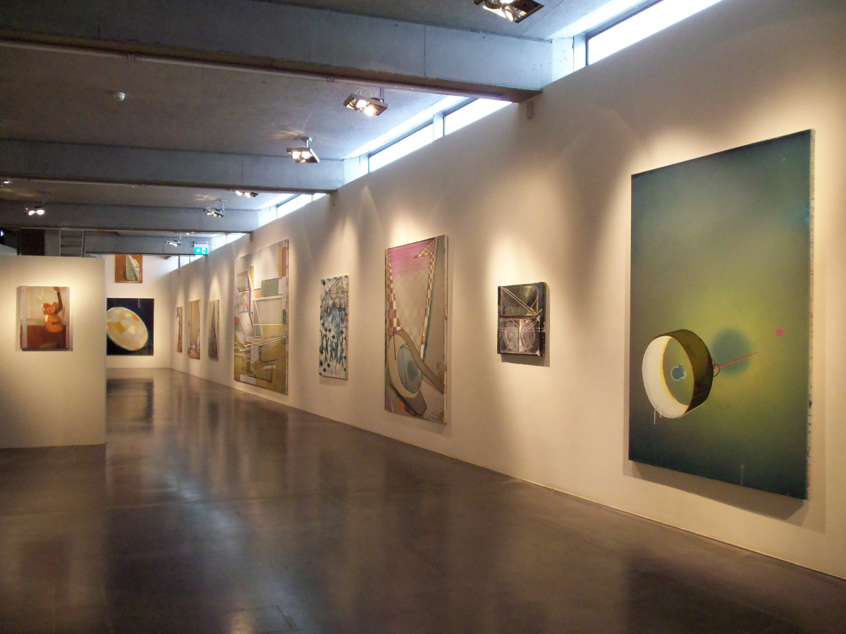 Christian Hellmich (*1977, Düsseldorf) beschreibt seine Malerei als „modular“ – einzelne abstrakte Formen kombiniert er immer wieder zu neuen Bildern und schafft so maltechnisch und kompositorisch komplexe, teils surreal anmutende Bildräume. Häufig wird dem Betrachter der Eindruck vermittelt, vermeintlich etwas wiederzuerkennen, ohne es jedoch klar zuordnen zu können. Für die in seinen Gemälden fragmentarisch zusammengefügten Motive greift Hellmich auf sein Bildarchiv zurück, das aus Fotos, Zeitungsausschnitten, Internetquellen, Postkarten u. ä. besteht. Dabei ist sein Vorgehen davon geprägt, wie die Gesellschaft in unserem heutigen mediatisierten Zeitalter mit Bildern umgeht. Charakteristisch für Hellmichs Malerei ist die Verbindung aus gestisch-abstraktem Malduktus und der asymmetrischen Anordnung von Farbflächen, aus der er eine geometrische, rasterartige Aufgliederung der Bildfläche entwickelt. Dabei vermeidet der Künstler stets eine einheitliche Perspektive, verschiedene Raumvorstellungen durchdringen sich gegenseitig, mehrere Bildebenen erscheinen simultan. Häufig sind es Verweise auf architektonische Konstruktionen und das Spiel mit comic-haften Formen, die in einer Art „Restgegenständlichkeit“ (Hellmich) ein Spannungsverhältnis zwischen Zwei- und Dreidimensionalität erzeugen. Diese im wahrsten Sinne ‚viel-schichtigen‘ Bildkompositionen, die Zusammenstellung einer oft bestechenden Farbpalette und das offensichtliche Wechselspiel zwischen der Zersplitterung ‚realer‘ Räume und der Neukonstruktion imaginärer Räume rekurrieren nicht einmal im Ansatz auf eine mimetische Art der Darstellung. Vielmehr richtet sich Hellmichs Interesse von Beginn an darauf, mit malerischen Mitteln ‚andere, hybride Welten‘ zu erschaffen, in denen eigene Struktur- und Formgesetze herrschen und die Konfrontation des Betrachters mit dem Unspezifischen die Sehnsucht nach identifizierbaren und assoziativen Inhalten weckt.